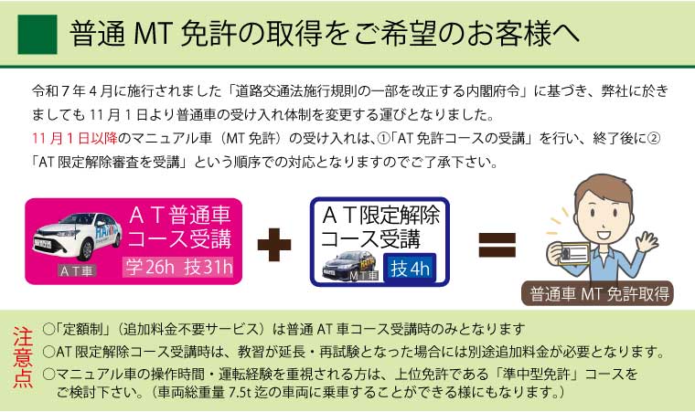 AT限定解除コースAT限定解除コースは「定額制」の対象外となります。